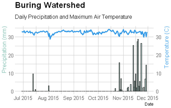 Here, we analyzed fire hazards in the Merang-Ngirawan basin for two contrasting climate extremes: (i) El Niño in 2015, and (ii) La Nina in 2016. Fire hazard was calculated based on the mKBDI, in which the hazard was categorized into three classes, namely: low (0–100), moderate (101–150), and high (>150). Every day, each cell in the basin was identified with this category, then the proportion area for each category was calculated. All sub-basins showed a similar pattern of fire hazards. Persistent high mKBDI was monitored during the dry season. In 2015, the impact of El Niño was prominent, as indicated by a huge area of high hazard (more than 60%, Figure 7). Proportion areas with high hazards can show fire vulnerability, with Merang and Kepahyang likely more fire-prone than Buring (Figure 9). The causes of the break points in Figure 9 on August 5 or October 25 were due to the precipitations as shown in Figure 10. In addition, a large area with a high hazard in both sub-basins developed earlier than in Buring.