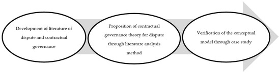 The research idea of this manuscript includes proposing a framework of GS, GM and a conceptual model through a literature analysis method that is widely used at home and abroad [77].Contract clauses, which are the main form of contract, define rights and obligations of each party. GSs for disputes are relatively explicit in clauses compared to clauses related to GMs. It is noted that GM study is much more difficult than GS study [68]. The MICS method was adopted to study the GS and GM by analyzing and comparing clauses of contracts. The conceptual model was verified based on cases provided for contract drafters. The methodology of this research is shown in Figure 1.