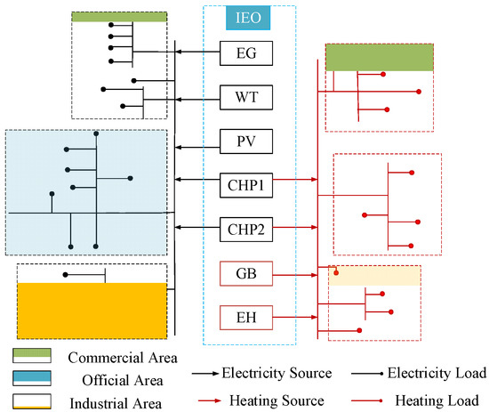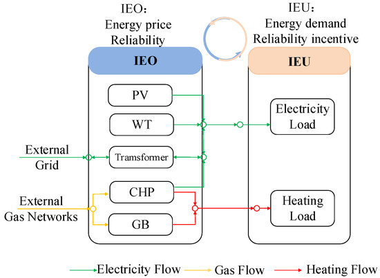 The IEM contains one wind turbine, one photovoltaic unit, two CHP units, and one gas boiler. The load types in the users are electric load and heating load. The IEO gives priority to dispatching units within IEM, and when sudden problems occur on the units, priority is given to dispatch other units within the region; if the supply shortage amount is too large, IEO will consider purchasing energy reservations from the external energy market to ensure system operation and meet users’ reliability demand. The overall energy structure of this IEM is shown in Figure 3. Since the energy generating units in IEM are usually close to the load centers and the topology of the distribution network and heat network is relatively simple with few nodes, we assume that there is no energy flow blockage.