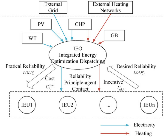 At the upper level, the IEO will purchase and dispatch energy operative reservations according to the reliability demand within the IEM, achieve a balance between the stable and reliable energy supply and the economic dispatch, and coordinate resources flexibly to meet the demand of multiple energy loads, and finally gain from the reduction of dispatch energy costs, energy sales, and auxiliary services of improving reliability. Its specific contents include regulating energy prices, negotiating reliability principal–agency contracts, deciding on whether to accept reliability service contacts or not, and allocating reliability resources.