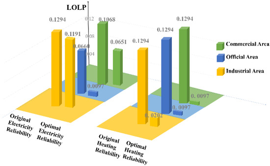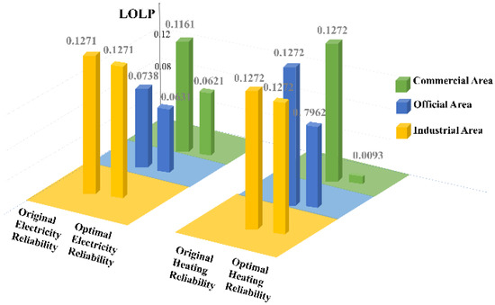 Comparing the energy reliability changes of different users between the peak and trough period, as shown in Figure 4 and Figure 5, all types of users’ energy reliability improves to different degrees, but there is variability in the improvement degree due to the users’ different reliability needs at different times. Comparing Figure 4 and Figure 5, for commercial users, 10 o’clock and 20 o’clock are both their earning time, so their electricity and heating reliability is greatly improved at that time. However, because 20 o’clock is more important, there is a slight increase in the reliability during this time compared to the former. For official users, energy is more profitable at 10 o’clock than at 20 o’clock; therefore, their reliability both improved to a greater degree at 10 o’clock, while the degree of reliability improvement for 20 o’clock is less. The industrial users’ loss of energy supply interruption is lower than the formers, so they have the lowest desire to seize reliability resources; at 20 o’clock, the reliability improvement is zero because of its being unprofitable. In addition, the overall degree of heating reliability improvement is higher than that of electricity, because the unit cost of heating reliability improvement is lower, and its cost-effectiveness for user profit improvement is stronger; therefore, there are more scenarios to give priority to heating reliability improvement in the limited fund allocation. In summary, after considering the reliability principal–agent, by energy dispatching optimization, the reliability resource allocation can be optimized according to the users’ personalized demand, and the users’ loss of energy supply interruption can be reduced; consequently, a win–win situation can be achieved under the cooperative game between IEO and users.