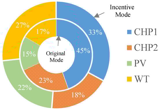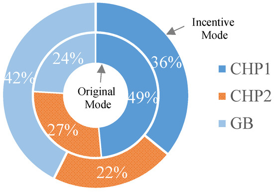 To explore the impact of the proposed model on the basic energy dispatch situation under normal operation scenarios, this section compares the energy dispatch of IEO for each unit’s output in original mode and incentive mode, comparing the proportion of each unit’s output in the electricity part and heating part under different modes. As a result, it verifies the effectiveness of the model for optimizing the dispatch cost, and it verifies whether it is a good guide for the energy dispatching structure.