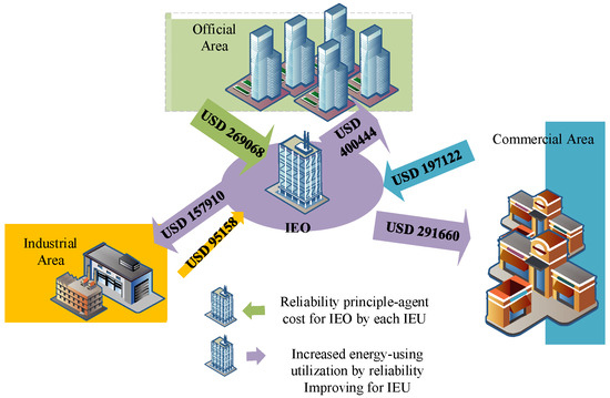 - In terms of economy, on the one hand, the model effectively reduces the energy dispatching cost of IEO, because of the improvement of reliability in the system, the space for low-price sustainable energy consumption is enhanced; on the other hand, the loss of energy supply interruption for IEUs is targeted, and their energy utilization are improved to different degrees, which realizes the win–win situation of multiple participants in the cooperative game.