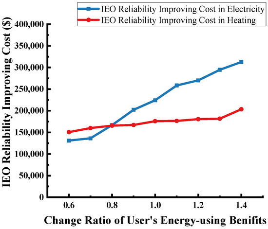 As shown in Figure 10, the reliability improving cost tends to increase with the increase of user energy-use benefits . This is because the increase in users’ benefits will directly affect the size of the reliability principal–agent contract and the scope of reliability-improving funds available. In terms of electricity, the cost of improving reliability increases faster in the benefit smaller stage and slows down slightly in the later stage. This is because, within a certain range, it is easier to improve the reliability in the electricity part, and a larger improvement can be achieved at a lower cost; therefore, in this part, there is a large profit space for the reliability principal–agent on the IEU side, and the money amount for reliability improving rises significantly. However, as the degree of reliability increases, its unit reliability improving cost will become larger, and the profit margin from reliability improvement becomes smaller for users, so the growth rate of the volume of the reliability principal–agent contracts slows down, and thus, the growth rate of the money used by IEO for reliability improving also decreases slightly. For the heating part, its reliability improving cost is in a steady and slow growth state, which is because the heating reliability demand does not change much with the user’s energy-use benefit, consequently, it is in a slowly rising trend.