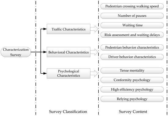 Individual psychological differences in crossing decisions at unsignalized crosswalks can lead to different decision options. There are many factors that affect the psychological characteristics of individual pedestrians, such as age, gender, and personality differences, which have different effects on the key indicators of pedestrian crossing, such as anxious waiting psychology on the acceptable gap in crossing, risk estimation of pedestrian–vehicle conflict, and even their own crossing speed. Pedestrians also have some common psychological characteristics, including group psychology, dependency psychology, and efficiency optimization psychology, so it is important to study the externalization of the psychological characteristics in crossing behavior.