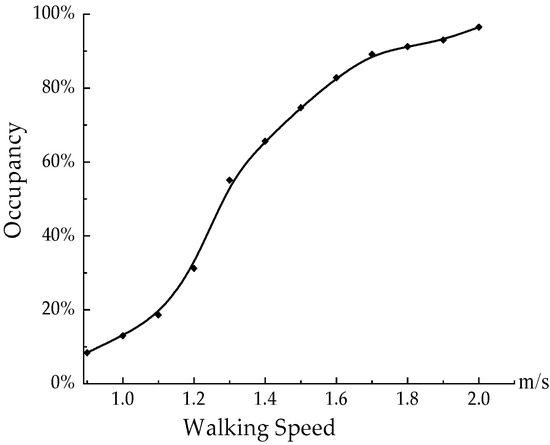 The influence of walking speed was studied by individual pedestrian attributes. The average walking speed of the pedestrian group crossing the street is 1.25 m/s, with the peak concentrated at 1.1–1.3 m/s, which conforms to the normal distribution. In particular, age has the greatest influence on the average walking speed: where age increases, walking speed decreases. The overall walking speed of males was greater than that of females, and the higher the vehicle speed, the faster the pedestrian crosses the street. The percentage of pedestrian walking speed is shown in Figure 2.