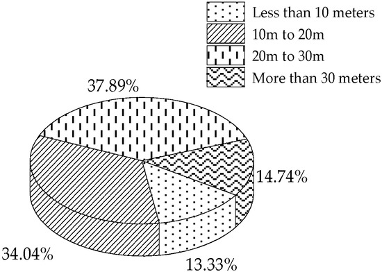 As shown in Table 1, about 15% of pedestrians need to pause three times or more to cross the street, in order to reduce the risk of the crossing and ensure the safety gap of the crossing, of which 12.28% can directly cross the street, and 39.30% and 33.33% pause once and twice, respectively. The statistical results show that, although crosswalks are set up on the unsignalized road sections, the absence of clear distribution of road rights forces pedestrians to pause several times to cross the street smoothly. The waiting time shows the same trend as the number of pauses in the crossing, with 70.18% of the waiting times in the range of 10–30 s. In addition, the statistical results of the phenomenon of “rush” indicate that pedestrians become less aware of the safety risks associated with “rush” as the waiting time increases.