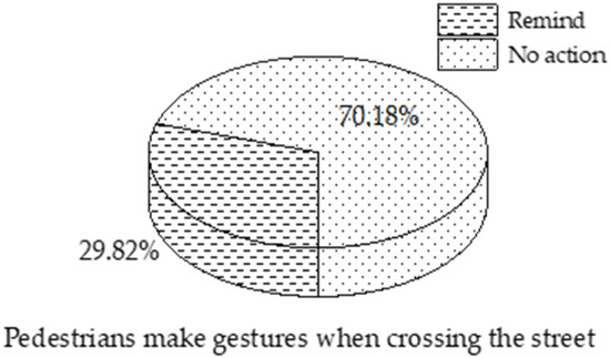 As shown in Figure 3 and Figure 4, more than 80% of crossing pedestrians observe the location of vehicles at a distance of 10 m, while 14% of pedestrians observe at a distance of up to 30 m or more, which ensures that the pedestrian maintains a safe distance from straight ahead vehicles, to judge the passing conditions. When the vehicle is close, only 29.82% of pedestrians give crossing information and make signs to alert drivers when crossing the street, reducing the risk of crossing the street by informing drivers of their own choices.