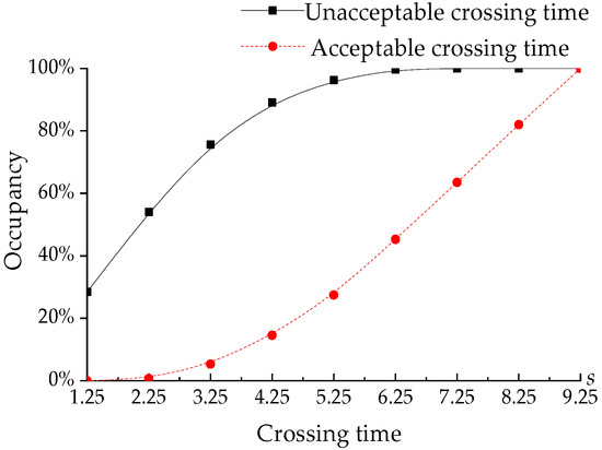 Since the acceptance of safe crossing gaps varies, there are differences in pedestrians’ waiting time and number of pauses to cross the street. The active waiting time for crossing can reflect the traveler’s need for safe crossing gaps, while the passive waiting time can be used to study the effect of pedestrian psychological changes on behavioral decisions, which means a direct relationship between waiting time and pedestrians’ decision to cross with a risky rush.