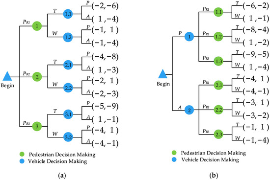 General form of the unfolding game. (a) Pedestrian first decision. (b) Vehicle first decision.