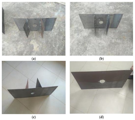 To discuss the role of the angle of connection between the wing wall and the end wall on the soil support, this study considered the retaining effect of four different diaphragm wall structures for small and large displacements. In Figure 2, the diaphragm wall structure used in the model experiments is shown in four cases: wing wall outwards, wing wall inwards, wing wall perpendicular to the end wall, and no wing wall. In the case of small displacements, the cavity was always partially stress constrained, but the stress generated by the diaphragm wall was less than the earth pressure behind the wall. In the case of large displacements, there was no stress constraint at the opening, and the soil was free to flow.