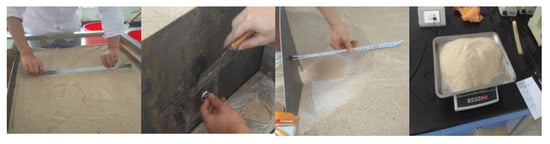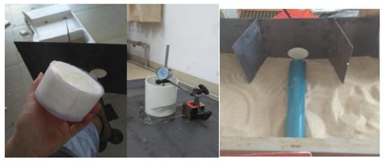 The experimental setup for the large displacement case involved closing the cavity with a steel plate. After the filling was complete, the steel plates were removed to simulate the effect of supporting the underground diaphragm wall without the restraint of the cavity door. The standard sand was placed in the tray at the lower end of the hole and filled into the model in uniform layers. Once the specimen in the model had filled the mold, the steel plate was pressed down by hand and quickly removed so that the sand and gravel could flow out of the hole behind the plate. The support effect of this type of diaphragm wall was estimated by measuring the mass of the specimen flowing out of the hole. When the gravel behind the plate was stable and did not continue to slide, the collapse area was measured. The width parallel to the end wall, the depth perpendicular to the end wall, and the maximum value of the width and depth of the collapsed area in the mold were measured. The experimental procedure is shown in Figure 4.