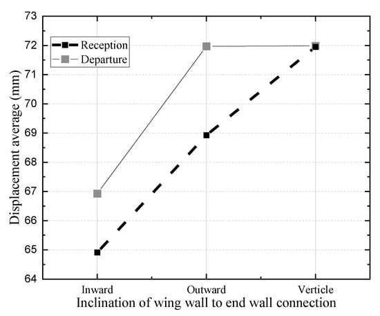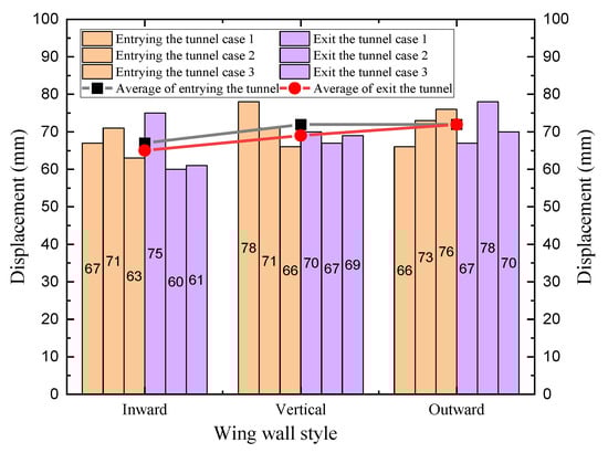 In the small displacement experiment, the average value of the displacement of the foam circular cake at the start and arrival of the shield when the angle between the wing wall and the end wall connection was different. In Figure 10, it can be seen that the deflection angle of the wing wall is not significant in supporting the end soil when small displacements are experienced. However, under the same experimental conditions, the displacements out of the hole are all smaller than the displacements into the hole. This indicates that the overall displacement of the incoming hole is large, and the supporting structure of the hole has a supporting effect on the outflow of sand during the outgoing hole. Three sets of control tests were set up, and the average values of the displacements of the three control groups under the same experimental conditions were found, as shown in Figure 11. By observing the displacement of the foam cakes, the effect of the corresponding diaphragm wall style could be inferred. The analysis found that the deflection angle of the wing wall did not significantly change the support effect of the end soil when small displacements occurred. In the case of small displacement, the deflection angle of the wing wall did not change the support effect of the end soil very significantly. Meanwhile, the Π-formed ground connection wall with the same wing wall deflection angle produced slightly larger overall displacements during shield entry. This is because the model tunnel at the cavern entrance had a certain blocking effect on the sand exit from the cavern entrance.