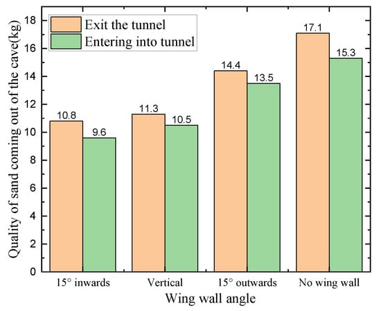 The test results for different wing wall deflection angles at large displacements are shown in Figure 12. In terms of sand output, the sand output from the diaphragm wall with wing walls was significantly higher than that from the diaphragm wall without wing walls. Without the wing wall, the sand output was 17.1 kg, but, with the wing wall deflected inwards, the sand output was only 9.8 kg: a difference of almost twice as much. At the same time, the angle of deflection of the wing wall in the case of having a wing wall also had a different effect on controlling the amount of sand outflow, with the inward deflection having a better support effect; the further the outward deflection, the more sand outflow, as shown in Figure 12.
