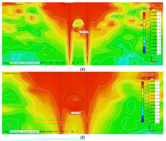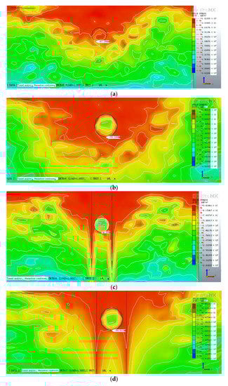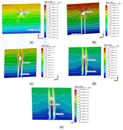 The forces inside and outside the wing walls of the diaphragm wall during the departure of the shield are shown in Figure 14 and Figure 15, respectively. As the length of the wing wall increased, the major principal stresses in the end wall tended to decrease. The presence of the wing wall played an important role in the stress redistribution in the end wall, and the major principal stress value shifted from the end wall position to the wing wall position as the length of the wing wall increased. The red areas in the stress cloud diagram, which appear mainly near the cavity, indicate the higher stresses here. When the wing wall appeared, the stresses around the hole appeared to decrease, and the red areas appear on the outside of the wing wall where the stresses increased and became more pronounced on both sides of the wing wall as the length of the wing wall increased.