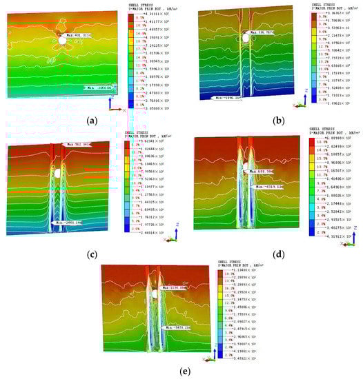 Internal stress distribution clouds for different styles of diaphragm wall. (a) No wing wall. (b) Wing wall is 2 m. (c) Wing wall is 4 m. (d) Wing wall is 6 m. (e) Wing wall is 8 m.