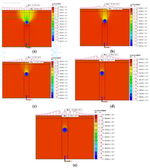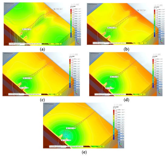External stress distribution clouds for different styles of diaphragm wall. (a) No wing wall. (b) Wing wall is 2 m. (c) Wing wall is 4 m. (d) Wing wall is 6 m. (e) Wing wall is 8 m.