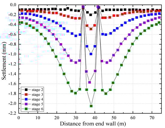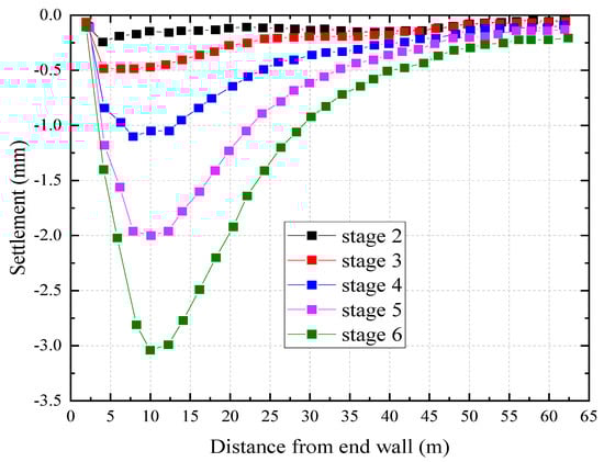 During the tunnel boring process, the maximum settlement of the ground surface is generally distributed along the axis of the tunnel; therefore, two typical paths of the ground surface were selected, as shown in Figure 9. Observation points were set at 2 m intervals along the observation path, with a total of 31 observation points along the tunnel axis, numbered in sequence. A total of 41 observation points were set up on the observation path 4 m away from the end wall and were numbered sequentially. Settlement was specified to be positive along the negative z-axis. As the displacement at stage 1 was specified as zero, Figure 16 shows the distribution of surface settlement along the axial direction of the tunnel at stages 2–6. Figure 17 shows the distribution of surface settlement parallel to the end wall at 4 m at stages 2–6.