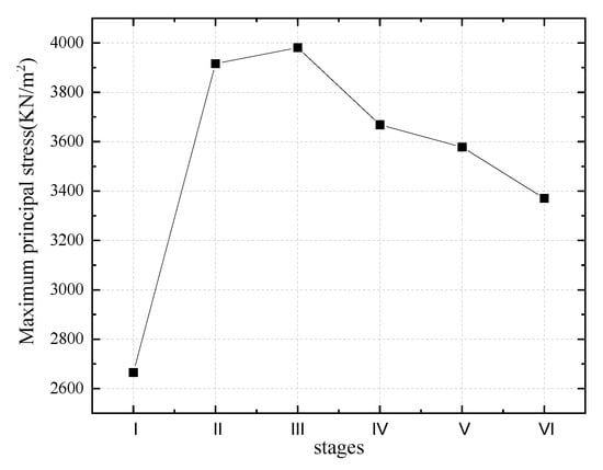 The data of the maximum values of the major principal stresses in the Π-formed diaphragm walls under different stages were compiled and analyzed, as shown in Figure 20. It was found that the maximum value of the major principal stress became larger concerning the initial ground stress when the shield passed through the wing wall of the Π-formed diaphragm walls. As the shield advanced, the maximum value of the major principal stress tended to increase and then decrease, and the maximum value of the major principal stress was large in stages 2–3, which means that this process is the dangerous stage.