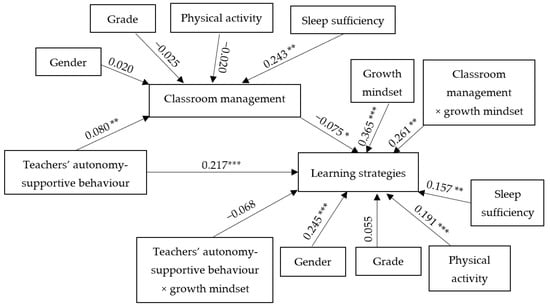The importance of perceived classroom management and growth mindset for the relationship between perceived teachers’ autonomy-supportive behaviours and learning strategies applied by the students. Notes: *** p < 0.001; ** p < 0.01; * p < 0.05.