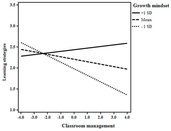 Simple slope tests indicated that the relationship between perceived classroom management and the students’ use of learning strategies changes direction depending on whether a student has a higher or lower growth mindset. For students with a lower or moderate growth mindset, greater perceived classroom management is related to the lesser use of learning strategies. However, for those with a higher growth mindset, greater perceived classroom management is related to the greater use of learning strategies (see Figure 3). The effect size of interaction is small (∆R² = 0.0112) though significant (p = 0.002).