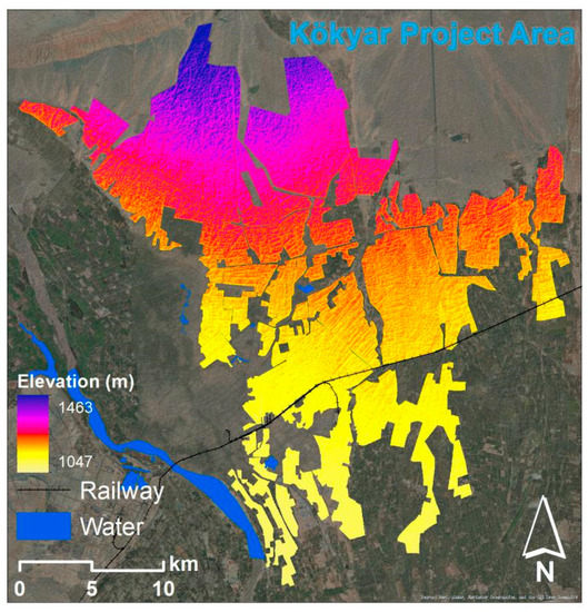 Kökyar is located in the northeast of Aksu, Xinjiang, close to the suburbs of Aksu City. The desert area in the east is the main birthplace of the Aksu sandstorm. The Kökyar Project Area starts from Wensu County under the Tomur Peak of Tianshan Mountain in the north; it spans the urban area of Aksu City and connects with the Tuanchang of Alar City on the edge of the Taklimakan Desert in the south (Figure 1). It is a desert with vertical and horizontal gullies and sparse vegetation in the alluvial platform between the Aksu River and the Tailan River at the southern foot of Tianshan Mountain. It is commonly known as “Kapo”, which is located in Aksu and the northeast suburb of Wensu County on the northern edge of the Taklimakan Desert (known as the “Sea of Death”) [24].