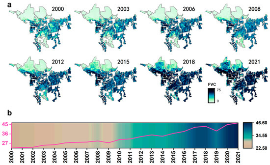 Spatiotemporal changes in FVC in Kökyar Project Area from 2000 to 2021. (a) Spatial distribution map of FVC in Kökyar Project Area from 2000 to 2021. (b) Time-series changes in FVC in the Kökyar Project Area from 2000 to 2021.