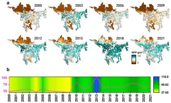 Spatiotemporal changes in NPP in Kökyar Project Area from 2000 to 2021. (a) Spatial distribution map of FVC in Kökyar Project Area from 2000 to 2021. (b) Time-series changes in NPP in the Kökyar Project Area from 2000 to 2021.