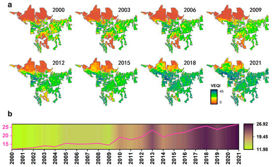 Spatiotemporal changes in VEQI in Kökyar Project Area from 2000 to 2021. (a) Spatial distribution map of FVC in Kökyar Project Area from 2000 to 2021. (b) Time-series changes in VEQI in the Kökyar Project Area from 2000 to 2021.