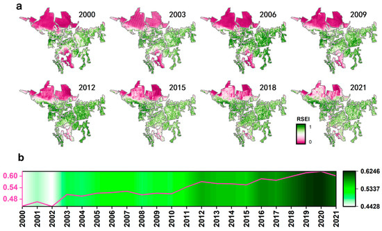 Spatiotemporal changes in RSEI in Kökyar Project Area from 2000 to 2021. (a) Spatial distribution map of FVC in Kökyar Project Area from 2000 to 2021. (b) Time-series changes in RSEI in the Kökyar Project Area from 2000 to 2021.