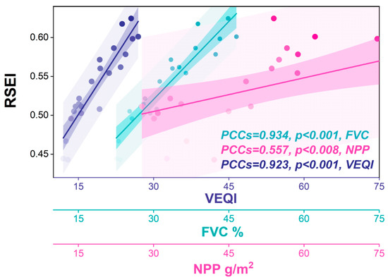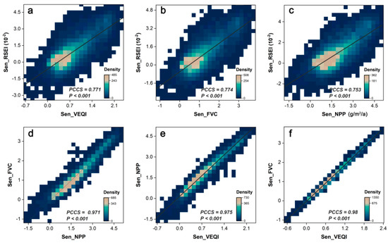 It can be seen from Figure 7 that the PCCs between the NPP, FVC, and VEQI were greater than 0.95 (Figure 7d–f), indicating that these three indicators had a very significant positive correlation in the time-series changes. The PCCs between the RSEI and the three indices were low, but larger than 0.75, and all passed the significance test (Figure 7a–c). Secondly, among the three indicators, the PCC between the FVC and the RSEI was the highest (0.774) (Figure 7b), while the PCC between the NPP and the RSEI was the lowest (0.753) (Figure 7c), which is consistent with the conclusion drawn in Section 4.2.1. This shows that the correlation between the RSEI and the NPP, FVC, and VEQI is consistent at the panel and pixel scales.