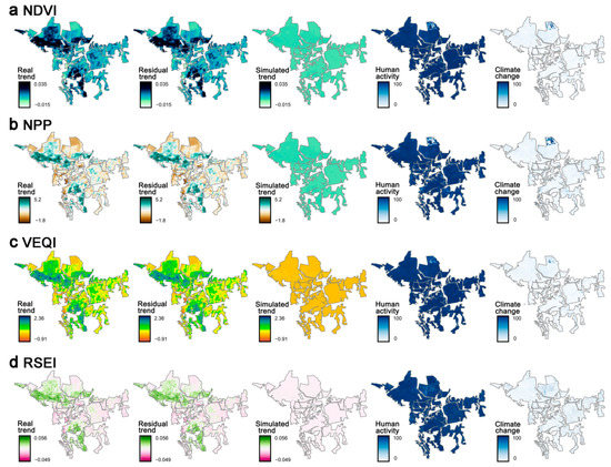 As can be seen from Figure 8, the FVC, NPP, VEQI, and RSEI in most areas of the Kökyar Project Area showed a significant upward trend from 2000 to 2021. Additionally, the changing trend of these vegetation parameters and the RSEI driven by human activities (residual trend) was highly consistent with the spatial distribution of the corresponding actual trend. This indicates that human activities were the dominant factor in the change in the vegetation parameters and the RSEI in the project area from 2000 to 2021. Secondly, the changing trend of the vegetation parameters and the RSEI driven by climate factors was relatively weak, indicating that the vegetation parameters and the RSEI in most areas were less affected by climate. From the spatial distribution map of human activity contribution and climate change contribution in Figure 9, it can be seen that over the past 22 years, human activities have been the dominant factor in the changes in the vegetation parameters and the RSEI in the Kökyar Project Area.