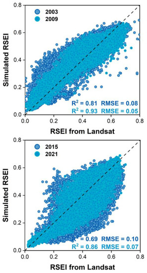 Scatter fitting diagram of the RSEI simulated by TEE-RESTREND and the RSEI retrieved by Landsat (2003, 2009, 2015, and 2021).