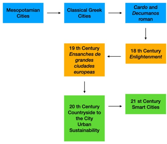 Figure 1. History line of the evolution of cities from Mesopotamia to current smart cities.