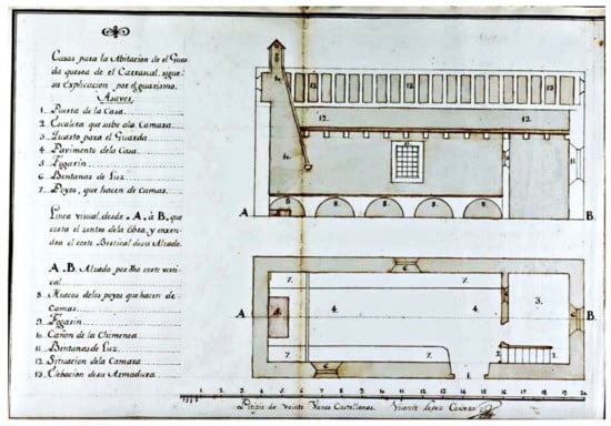In the minutes of the Board of Proprietors of 1794, there is a letter from the intendent, dated 7 July, which mentions that, ultimately, due to the decrease in private income from the pastures for horse breeding, those newly built constructions estimated by López Cardera were suspended [36]. In the execution of these construction works, the drawings provided by López Cardera played a fundamental role. In the Modern Age, unlike nowadays, there were no legal regulations or calculations comparable to the current ones, but they used drawings and plans, such as the ones that accompany the analysed report, which, along with the corresponding texts, facilitated the understanding of the interventions to be conducted.
