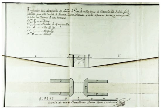 Regarding the sewers, López Cardera proposed intervening in those of the three streams: Guta, Benavente, and Huelma. The sewer of La Guta was in such poor condition that it had to be built again, and the report specifies the work that had to be conducted (Figure 4).
