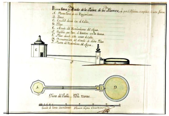 The preservation of the architectural and cultural heritage of cities is a matter of great importance, particularly the preservation of those elements that are under some type of historical–artistic protection [21,22,23]. As Go-Eum [21] says, heritage assets are not only part of the culture and history of the people, they also provide historical spaces for future generations, contributing to their sustainable availability through the application of photogrammetric techniques or 3D scanning, among others [24,25,26]. Within this process, an archival study and analysis of the documentation related to the heritage must be the starting point, valuing not only the buildings or infrastructures themselves, but also the history and the most relevant characters related to them, which in turn are part of such heritage. In the world, there are numerous studies about water collection and channeling in cities. For instance, the improvement of urban planning in the Hellenic period led to the pursuit of an efficient management of rainwater [27]. With the Roman Empire, the first water channeling systems were created, using complex engineering systems for the design of sewage and cesspools. Similarly, in the Byzantine period, and in Al-Andalus, the rivers were used as sewers and outlets to manage the hygiene of cities. In the Modern Age, a known example is the engineering work for the water channeling in Venice (Italy) [28].