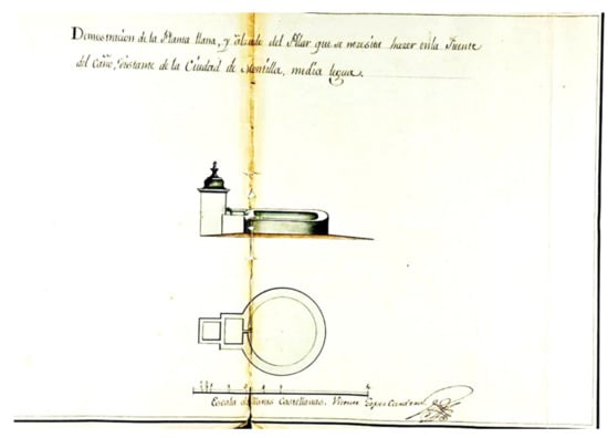 The area of Montilla was very rich in water, and thus it had a large number of fountains and wells that supplied the city. In 1872, a water channeling system was created from the El Cuadrado spring, thanks to engineer José Ma Sánchez Molero [29,79]. The supply of water, so necessary for hygiene and health in the cities, was achieved through a series of fountains, in addition to the wells, which were located in some of the private houses. The sanitation of the water entry points into the houses and fountains that supplied the cities was very important to counteract the high rate of mortality derived from the poor hygiene conditions [80,81]. The owners of the lands where the water flowed, supplying the public fountains, sold, rented, or gave their exploitation to the town hall, other institutions, or private clients [82]. It is known that in 1777 there were no public fountains in the centre of the city, and that the deepest wells were forty yards deep [83] (ff. 193–194). Therefore, in his work, López Cardera paid special attention to their inspection and intervention propositions. His knowledge of hydraulic engineering would probably have come from the treatise of Teodoro Ardemans, an architect, writer, and higher plumber of Madrid who, among other works, elaborated the 1720 Madrid Ordinances [82], which was a key piece for architects and master builders of the 18th and 19th centuries, as well as a treatise exclusively dedicated to the topic of water [84]. These works were, in turn, fundamental for the Marquis of Ensenada in the construction of his famous Catastro around 1749.