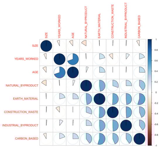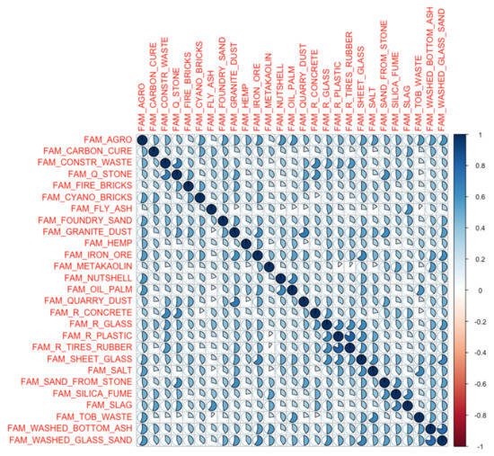 Means and standard deviations for the initial dependent variables of familiarity with each of the 27 sand substitutes are provided in the Appendix A (Table A1). The means of the five most familiar substitutes on five-point scales were fly ash (3.90), recycled concrete (3.79), crushed aggregate from quarried stone (3.72), construction and demolition waste (3.65), and recycled glass (3.38). The means of the five least familiar substitutes were tobacco waste (1.48), oil palm shell (1.64), cyanobacterial bricks (1.70), iron ore tailings (1.94), and nutshell (1.95). Intercorrelations of the 27 materials are provided in Figure 2.