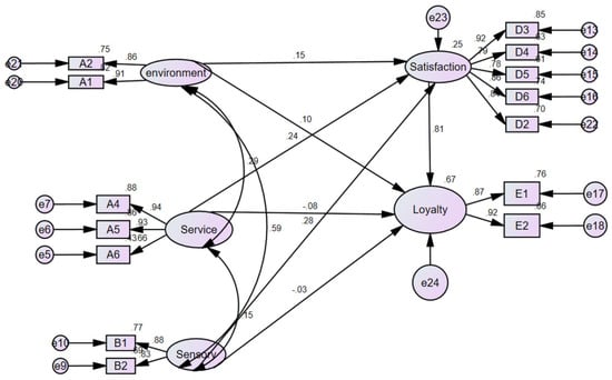 Following the model fit of CFA, non-visual sensory stimuli are excluded from the construct, leaving behind two visual sensory elements—scene and color. After conducting CFA to confirm the suitability of the measurement model (Table 8), SEM was then proceeded to test the proposed relationship among the constructs. The independent constructs include non-sensory environmental factors (environment), human and service factors (service), and visual sense (sensory), while dependent constructs include satisfactory experience and memories (satisfaction) and behavioral intention (loyalty). The resultant values of the coefficients are summarized in Figure 2.