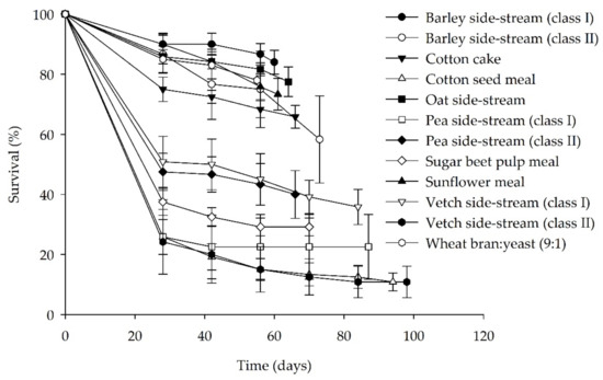 The survival rates of A. diaperinus larvae over time on the evaluated side-streams are shown in Figure 1, whereas the final survival rates at the end of the bioassay are presented in Table 1. The highest final survival rates were recorded for barley (class I) (84%) and oat side-streams (77.5%) and were similar to the survival rate recorded for the control (78%). In contrast, survival was low for both the vetch side-stream (class II) and cotton seed meal and did not exceed 10.8% at the end of the bioassay.