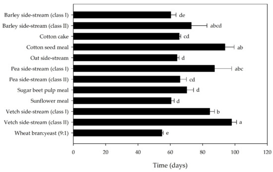 Eleven agricultural side-streams originating from the production and processing of barley, oats, sugar beet, cotton, sunflower, peas and vetch were evaluated. The nutrient composition of the side-streams and their energy content have been previously described [29] and are provided here as Supplementary Materials (Table S1). All side-streams were finely ground (Thermomix TM31-1C, Vorwerk Elektrowerke GmbH & Co. K, Wuppertal, Germany) to improve feed intake from A. diaperinus larvae, sieved at 500 μm and kept at ambient conditions until further use.