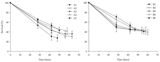 In general, similar survival patterns were recorded for both diet groups (Figure 4), with the final survival rate ranging between 30.8 and 43.3% for Group A and between 39.2 and 45.0% for Group B at the end of the bioassay (Table 2).