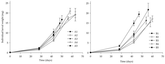 Individual larval weight at the end of Bioassay II for Group A varied between 14.8 (A1) and 20.9 mg (A2), whereas for Group B, final larval weight fluctuated between 16.2 (B4) and 21.5 mg (B5) (Figure 5, Table 2).