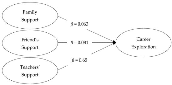 Then, the correlation among study variables was estimated. It was found that there was significant correlation between interpersonal factors and adolescents’ career exploration. In line with past research [,,], family support, peer or friend support, and teacher support for career exploration was positively related to the career exploration of adolescents. However, the highest correlation was between friend support and career exploration. This echoes the results of Arif et al., who reported peer support as a stronger predictor of career exploration than any other sources of social support []. The present findings are also consistent with previous research that found a significant correlation between interpersonal support and career exploration [,,].