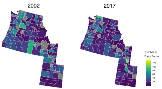 Number of dairy farms in the states of Idaho and Washington, in 2002 and 2017. Source: USDA Agricultural Census.