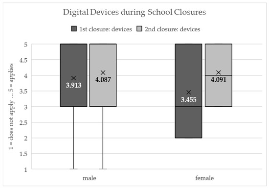 The digital equipment of male apprentices changed only slightly from the first to the second school closure (Figure 2). The situation for female apprentices was more differentiated, with higher variability in the first school closure. When interpreting the results, it must be noted that the case number of women is very small. Due to the small number of female apprentices (m: 103, f: 11), the gender differences were not analyzed using a t-test. However, the mean value for the second school closure increased to 4.1 while the variability was reduced. We attributed these results to female apprentices being provided with better access to digital devices during the second school closure than at the beginning of the coronavirus pandemic.