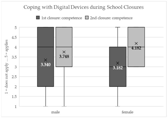 Coping with digital devices showed a mean value of 3.340 for male apprentices at the first school closure (Figure 3). This variable also showed an improved assessment for the second school closure with a mean value of 3.7. Variability also decreased. The median was unchanged at 4. Consequently, male apprentices’ coping with digital devices improved between the first and second school closures. For female apprentices, the mean increased much more noticeably from 3.2 to 4.2, and the variability also decreased. The median also increased from 3 to 4. Overall, it was concluded that coping with digital devices for female apprentices had improved significantly.