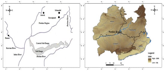 The study area is located in well-known geological terrain comprising a system of hills. It lies between 71°30′–73°30′ east and between latitude 32°23′–33°00′ north, and is marked by its location between the Thal Desert and Potowar Plateau in the west and northeast, respectively [21]. This range starts from the Potowar region and ends at the north side of the River Jhelum. The River Jhelum is one of the major tributaries of the Indus; it flows through this region, and is considered the central hydrological unit of the study area. Climatically, the area is characterized by low rainfall of about 50 cm, and the months of July, August, and September are the more rain-prone periods. Subtropical dry and evergreen shrubs are the main vegetation types [22,23]. The location map of the Potowar region and Salt Range is presented in Figure 1.
