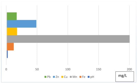 Salt Range coal contains sulphur with a mean content of 5.50% to 11.03% and a fixed carbon plus ash content of 13.20% to 32.80%, whereas the moisture content ranges from 3.145 to 4.25% and the heating value lies in the range of 1114–1425 BTU/lb [26]. Based on previous research after [27], I-geo values, tailings sediment, and mine water have been found to be the main sources of toxicity, threatening the good ecological status of the Salt Range and the entire Indus Basin of Pakistan. Iron and copper are found as anthropic loads, with Mn, Cd, Hg, and Se as emerging toxic elements. The overall geochemistry of collected AMD is shown in Figure 3.